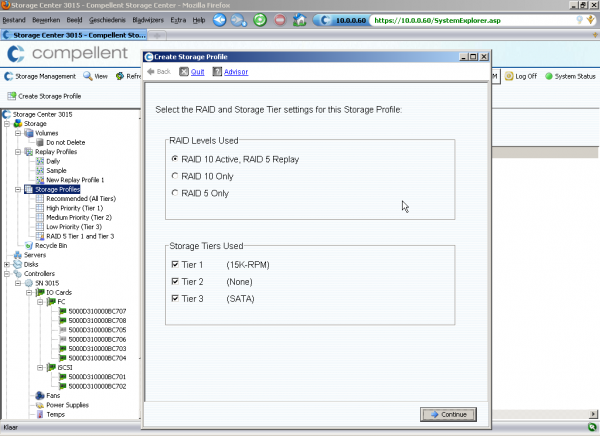Het webbeheer van Compellent Storage Center is helder gestructureerd. Uiterst links is er een boomstructuur met opslag, servers, schijven, controllers, noodvoeding, schijfmodules, systemen op afstand en gebruikers. Opslag definieert virtuele volumes, replay- en opslagprofielen. Er is ook een ‘recycle bin' zodat je gewiste volumes of profielen eenvoudig weer terug kunt halen. Servers definieert alle servers die toegang hebben tot het opslagsysteem. Schijven omvat alle opslagpools en structuren waaruit ze samengesteld zijn, in boomstructuurvertakkingen tot het kleinste onderdeel: een harde schijf. Controllers laat alle controllers in het rek zien. Je kunt van zo'n controller zijn eigen webbeheer openen, maar voor echt gecentraliseerd beheer heb je de Enterprise Manager nodig. Die krijg je standaard bij het Compellent Storage Center, maar er zijn andere functionaliteiten waarvoor je wel moet bijbetalen. De schijfmodules bevatten de via glasvezel aangesloten ‘enclosures' waarin harde schijven zitten. De systemen op afstand geven je de gelegenheid QoS (quality of service) te definiëren zodat het systeem weet welke opslagruimte het snelst is. Je kunt ten slotte meerdere gebruikers met verschillende beheerrollen definiëren. Als je verschillende rubrieken na elkaar opent, openen zich die in een tabbladinterface zodat je eenvoudig terug kunt naar vorige rubrieken. Erg gebruikersvriendelijk!