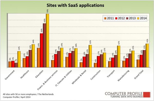 Als het gebruik van SaaS-applicaties wordt afgezet tegen alle geïnterviewde bedrijfsvestigingen met vijftig of meer werknemers, dan zijn de daaruit volgende penetratiecijfers als volgt; 15 procent van alle locaties maakt gebruik van een hr-oplossing in SaaS-vorm, in 2013 bedroeg dat nog 11 procent en in 2012 was dat 9 procent. Voor branchespecifieke software geldt dat nu 11 procent een SaaS-oplossing is, in 2013 was dat 8 procent en in 2012 6 procent. Voor kantoorapplicaties ziet Computer Profile SaaS-versies bij 10 procent van alle bedrijfsvestigingen, in 2013 bedroeg dat 4 procent en 2 procent in 2012.