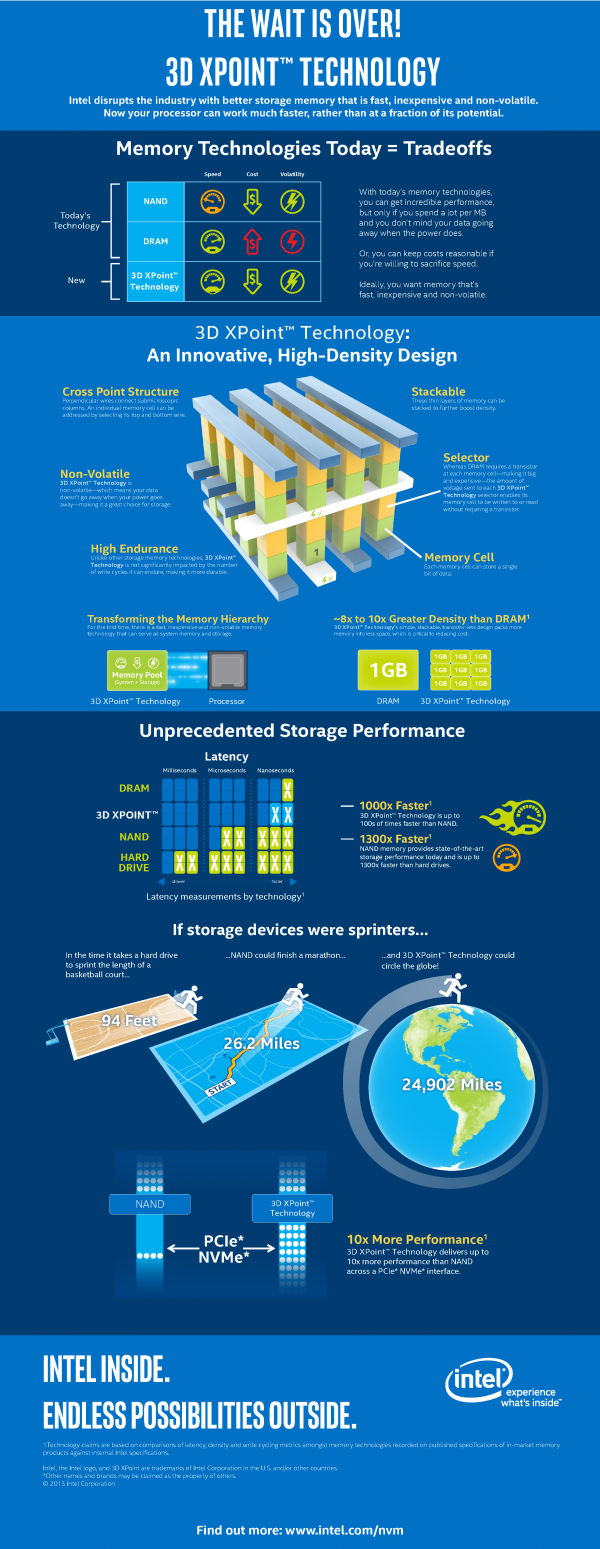 Intel en Micron komen met 3D XPoint-geheugentechnologie: een nieuw type niet-vluchtig computergeheugen. Dit is geheugen waarop data bewaard blijven ook wanneer het apparaat wordt uitgeschakeld. Het nieuwe type geheugen zorgt voor een snelle toegang tot grote hoeveelheden data. 3D XPoint-technologie is inmiddels in productie en is het eerste echt nieuwe type geheugen sinds de introductie van NAND-flashgeheugen, in 1989.