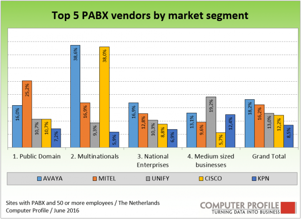 Een uitsplitsing van marktsegmenten laat verschillen zien voor de verschillende leveranciers. Avaya en Cisco zijn met allebei 38 procent bovengemiddeld vertegenwoordigd bij multinationals. KPN komt met bijna 6 procent in verhouding een stuk minder voor. Mitel wint het van Avaya binnen het publiek domein. Oplossingen van Unify komen bovengemiddeld voor bij mkb, namelijk ruim 19 procent.