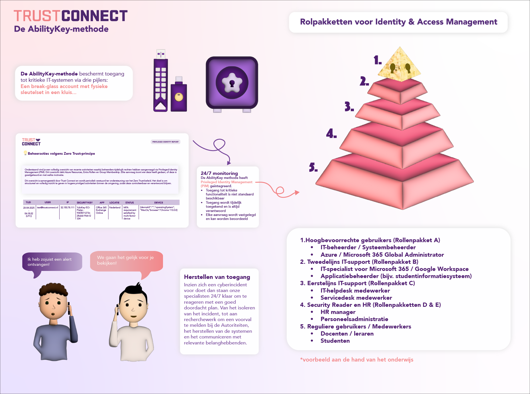 De AbilityKey beschermt toegang tot kritieke IT-systemen via drie pijlers: een break-glass account met fysieke sleutelset in een kluis, gecontroleerd rollenmanagement voor tijdelijke toegang en continue monitoring. Zo behouden organisaties altijd inzicht, controle en herstelmogelijkheden.