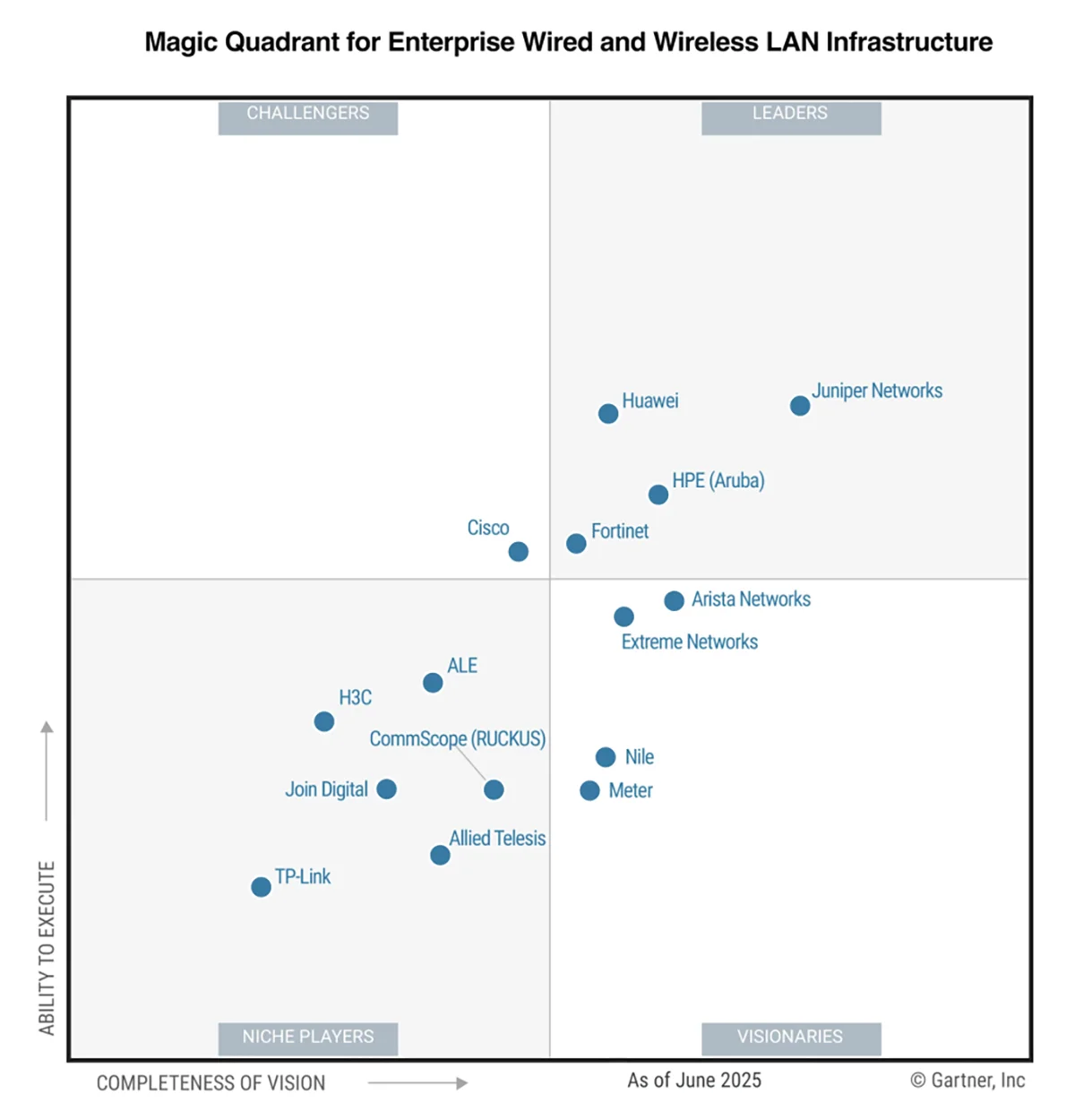 Hoe ontwikkelt de markt voor aanbieders van enterprise bedrade en draadloze lan-infrastructuur zich? Het befaamde magische kwadrant van Gartner geeft een beeld, waarbij in juni 2025 een schok door de markt ging toen gigant Cisco werd verplaatst van het kwadrant ‘leiders’ naar ‘uitdagers’. Automatisering van netwerkbeheer en -configuratie is de maatlat waaraan Gartner veel waarde hecht. ‘Cisco was minder bezig met wat de markt nu vraagt: meer automatisering, minder beheerinspanningen en een simpelere licentiestructuur.’