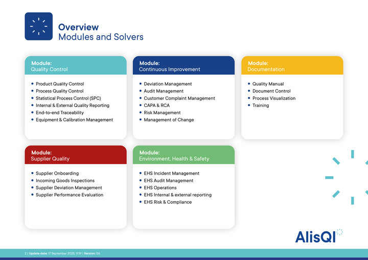 Solvers zijn gegroepeerd in vijf modules: Quality Control, Documentation, Continuous Improvement, Supplier Quality en Environment, Health & Safety (EHS). Maar omdat kwaliteitsproblemen vaak over meerdere domeinen heen spelen, kunnen klanten solvers vrij combineren tot een oplossing op maat.