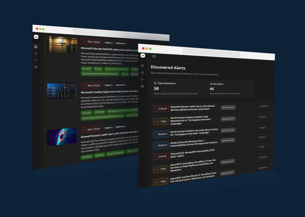 Met de Pro licentie kunnen organisaties één of meerdere domeinen toevoegen. AboutIntel koppelt dreigingsinformatie automatisch aan de extern zichtbare attack surface van deze domeinen, waardoor direct inzicht ontstaat in welk nieuws daadwerkelijk relevant is voor de eigen organisatie.