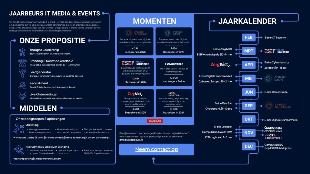 Van Zorg & ICT, ESEF Maakindustrie, Cybersec Europe, Cybersec Netherlands, ICT&Logistiek tot de Computable Awards, waar kennis, innovatie en ontmoeting samenkomen.